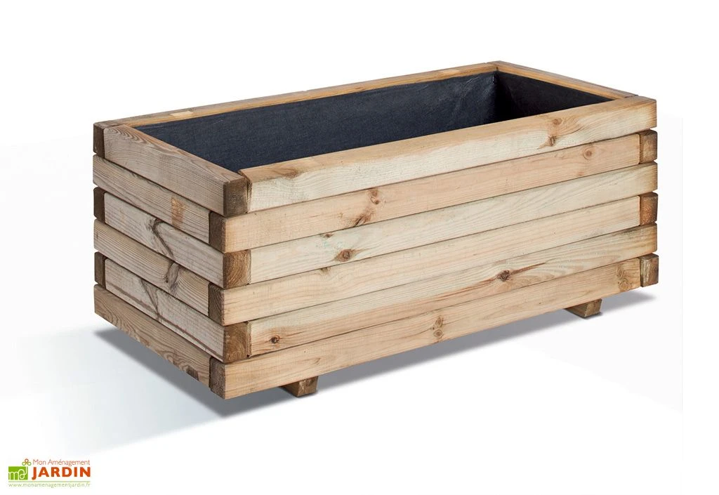 Ses dimensions intérieures sont de 92 x 42 cm (longueur, profondeur), ce qui vous offre une contenance de 143 L. Cette jardinière possède des dimensions totales de 100 x 50 cm (longueur, profondeur) sur 43 cm de hauteur. L’épaisseur du bois est de 4 cm. Vous retrouverez 8 lames de 4 x 5 cm (largeur, hauteur) sur chacune de ses faces.