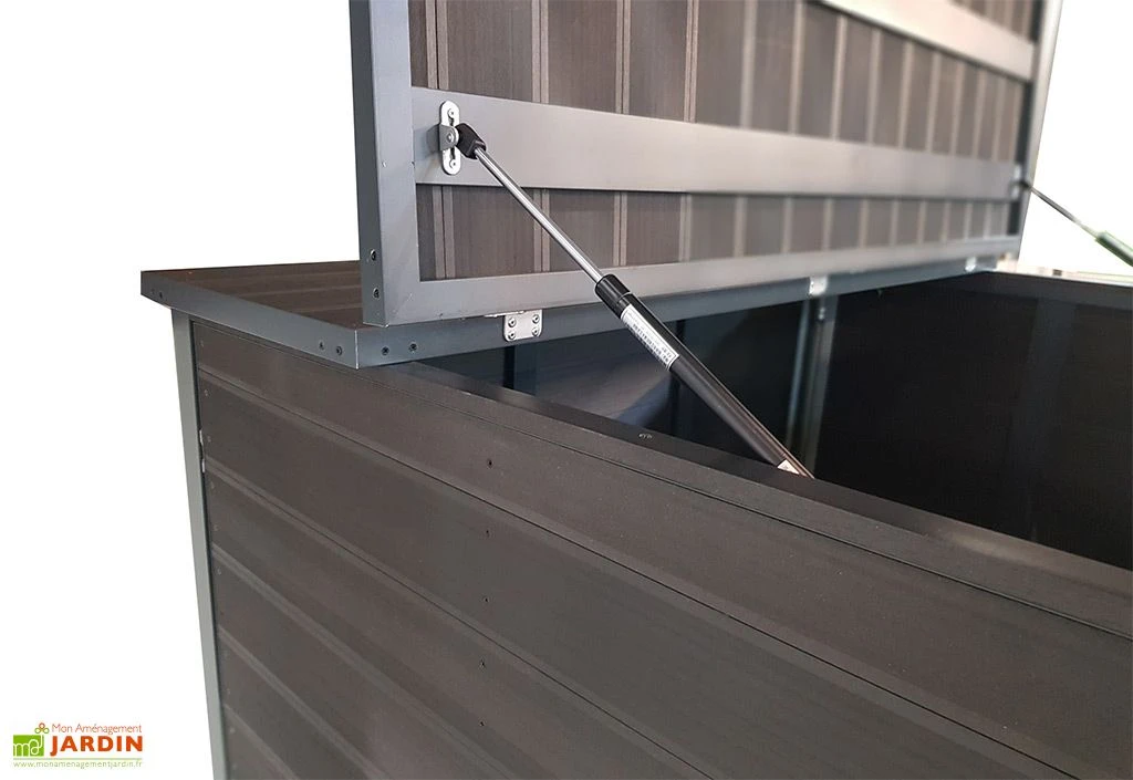 Ce coffre de jardin est fabriqué en matériau composite et en aluminium, ainsi il ne craint pas la moisissure, la corrosion ou l’attaque d’insectes et ne vous demande aucun entretien. Il mesure 1,15 m de profondeur, 1,55 m de largeur et 1,20 m de hauteur. Pratique il s’ouvre grâce à une double porte à l’avant et grâce à un couvercle avec vérins au-dessus.