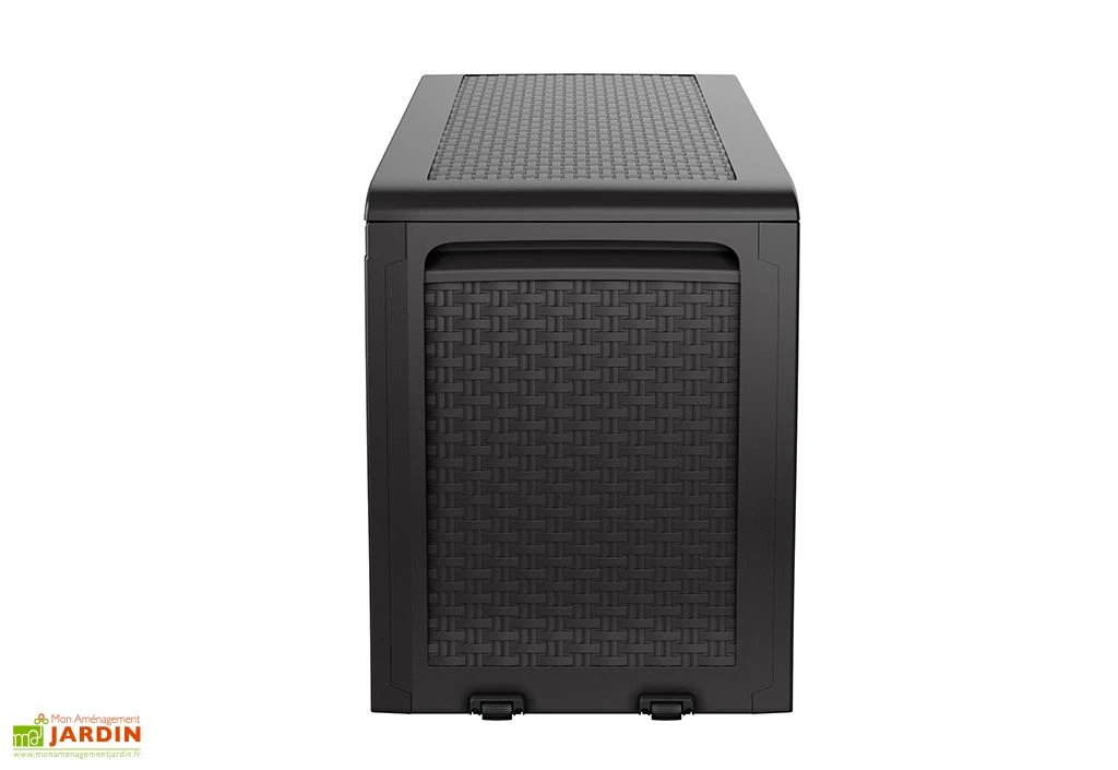 Le coffre de rangement extérieur est fabriqué en polyéthylène gris, un matériau qui ne demande aucun entretien. Il a bénéficié d’un traitement anti-UV qui lui permettra également de résister à la décoloration et à la fragilisation dues aux rayons du soleil.