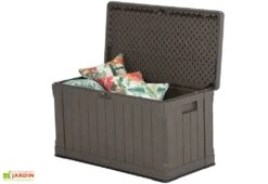 Le coffre de rangement mesure 107 cm de profondeur, 191 cm de largeur et 132 cm de hauteur. Les dimensions intérieures sont de : 180.9 x 97.8 x 118.7 cm. Il est en polyéthylène haute densité, un matériau qui résiste parfaitement à la moisissure, à la corrosion, aux attaques d’insectes et aux chocs. Il ne demande aucun entretien. Il peut contenir jusqu’à 2 124 litres. Idéal pour les vélos, le bois, les poubelles ou les équipements de jardin.