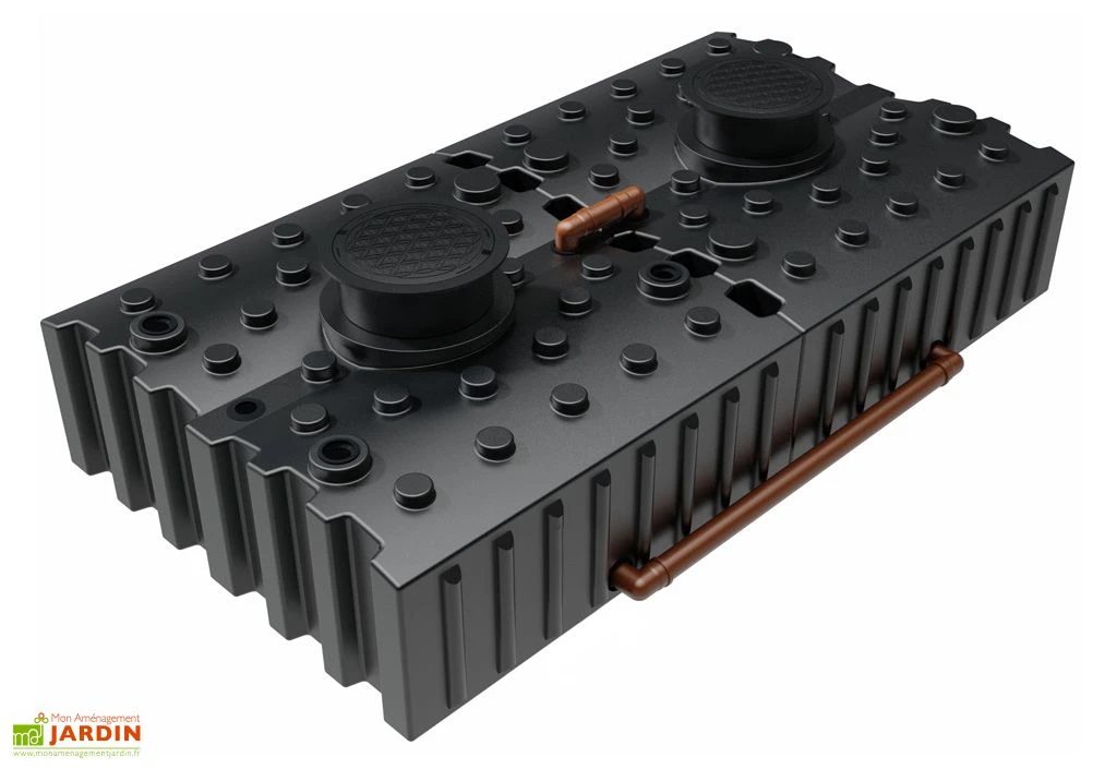 Cette double cuve de récupération d’eau de pluie enterrée fabriquée en Allemagne par GreenLife offre une contenance totale de 8000 litres grâce à 2 réservoirs de 4000 litres. Les cuves sont couplées et mesurent au total 440 cm de longueur, 242 cm de largeur et 124 à 144 cm de hauteur. La forme plate de cette cuve facilite son enfouissement.