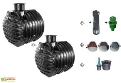 Vos 2 cuves de récupération d’eau de chez GreenLife peuvent accueillir chacune 6000 litres. Vous pourrez ainsi récupérer jusqu’à 12 000 litres d’eau de pluie. Les cuves sont en polyéthylène haute densité et disposent d’un dôme de compensation et d’un couvercle de sécurité pour un maximum de résistance. La livraison des cuves inclut un stabilisateur d’arrivée d’eau de pluie à installer au fond de la cuve, une pompe immergée avec un filtre aspirant, un interrupteur automatique et une protection contre la marche à vide, un boitier de branchements à l’eau, une grille de filtrage à poser sur les gouttières de 20 mètres, un tuyau de pression de 5 mètres et du matériel de marquage. Les cuves sont fabriquées en une seule pièce ce qui évite les soudures et donc renforce les récupérateurs. Les cuves et le kit vous permettent de récupérer l’eau de pluie et de la réutiliser dans le jardin. La garantie sur les cuves est de 15 ans et de 2 ans sur les accessoires. Votre cuve est livrée face à votre domicile. Votre aide peut vous être demandée pour le déchargement (prévoir le matériel nécessaire ou des personnes lors de la livraison).