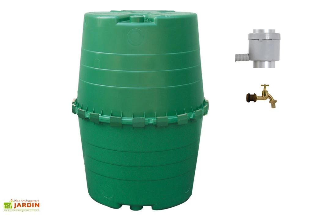 La cuve en polyéthylène mesure 118 cm de diamètre au niveau le plus large et 156 cm de hauteur, offrant une grande capacité de 1300 litres malgré ses dimensions compactes. Le polyéthylène est résistant aux conditions extérieures et le récupérateur ne demandera donc pas d’entretien face à la moisissure, aux insectes ou aux UV.
