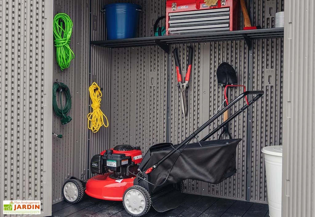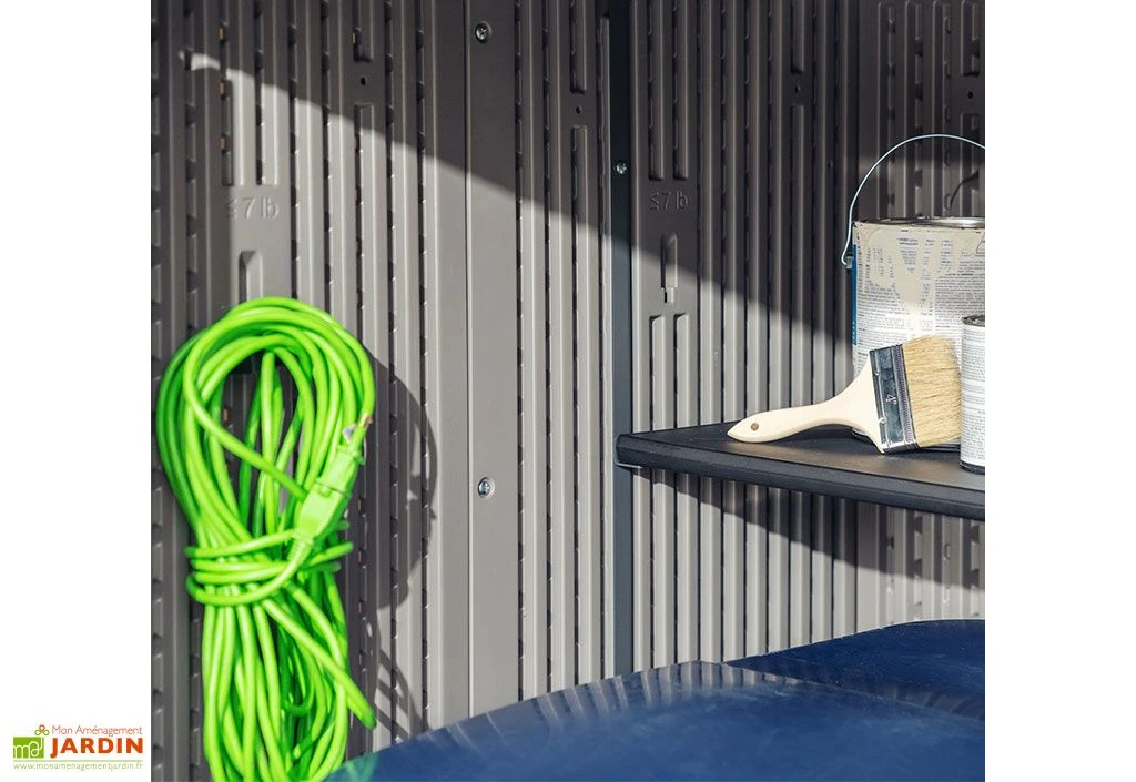 L’intérieur de cette armoire de jardin est équipé d’une étagère ajustable en hauteur et de divers crochets auxquels vous pourrez suspendre des outils de jardinage ou des rallonges électriques, par exemple. Ces crochets sont amovibles et pourront être disposés comme bon vous semble afin que vous puissiez organiser votre espace de rangement. Cette armoire de rangement d’extérieur mesure 193 cm de large sur 110 cm de profondeur et 177 cm de haut. Elle est livrée en kit, à monter soi-même, et occupera une surface de 2,1 m² une fois installée dans votre jardin.